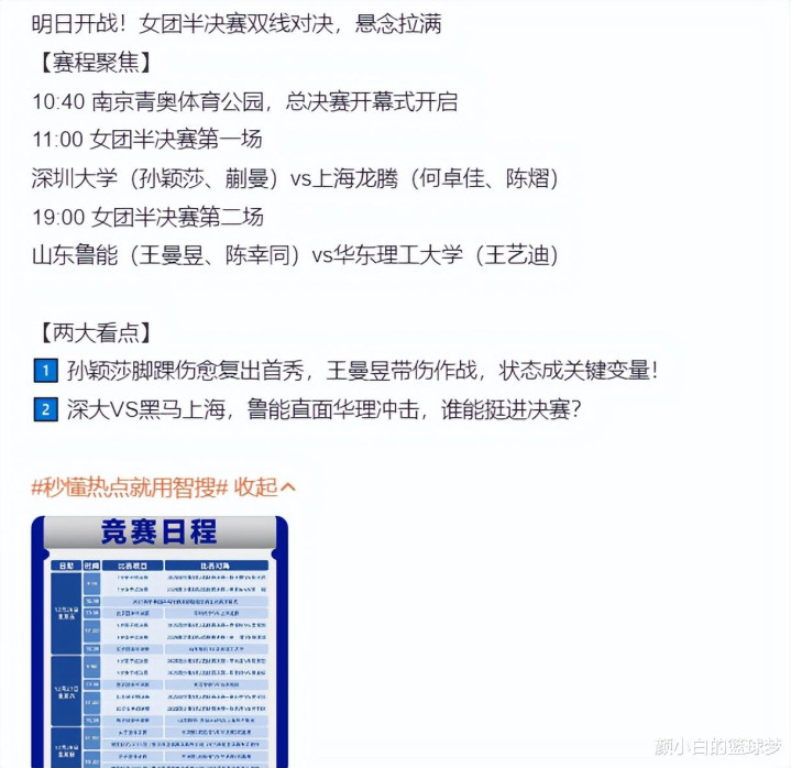 12月26日在南京青奥体育馆就要打响总决赛富配平台,11点女团半决赛第一场:深圳大学VS上海龙腾。(目前孙颖莎、王楚钦、王曼昱三人都没有确定出战,因为这三人都有伤在身)