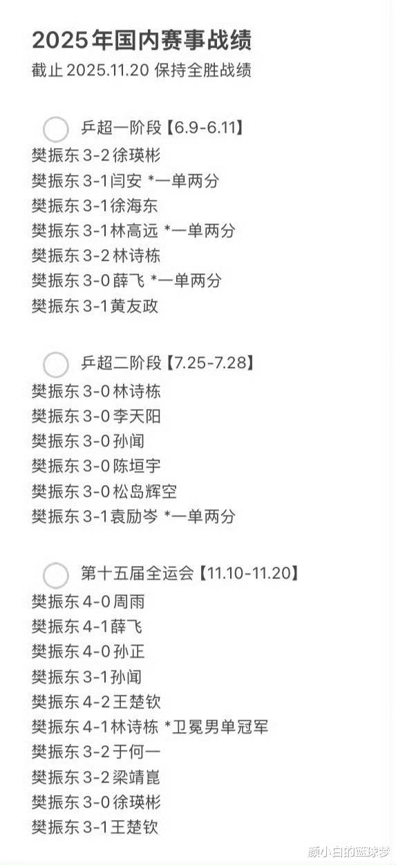 而且樊振东在整个2025赛季国内赛事是保持不败的: